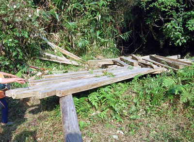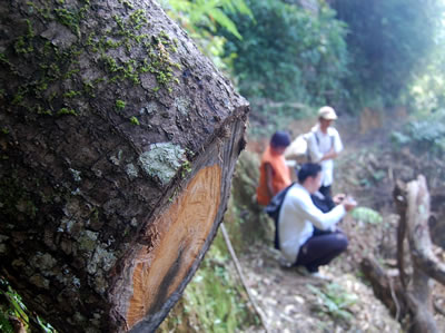 Càng vào sâu trong rừng, hình ảnh những gốc gỗ lớn vừa bị triệt hạ, lát cắt tươi rói cứ thế đập vào mắt chúng tôi. Có chỗ, cây đã được lâm tặc xẻ thành những phiến nhỏ, để ngổn ngang trong góc rừng chờ vận chuyển ra ngoài. Dự định vào sâu hơn nữa mong sẽ được “mục sở thị” cảnh lâm tặc “xẻ thịt” rừng, nhưng mưa lớn ập đến, chúng tôi đành phải xuống núi. Theo người dân bản A Réc thì bên trên cao cánh rừng là bản Aur. Người dân cả hai thôn xưa nay chưa bao giờ tham gia phá rừng. Có chăng là một vài năm trở lại đây, thỉnh thoảng người dân các thôn phát hiện có người lạ lên khai thác gỗ lậu, tuy nhiên do chúng rất manh động, sẵn sàng đe dọa, đòi đánh trả nên người địa phương chỉ còn cách tặc lưỡi làm ngơ.