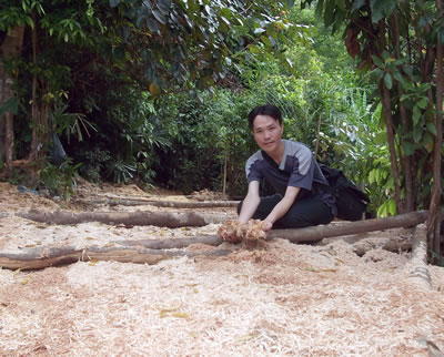 | Phóng viên Báo Công an TP Đà Nẵng tại hiện trường lâm tặc xẻ gỗ ở cánh rừng phòng hộ của Nam Giang. |