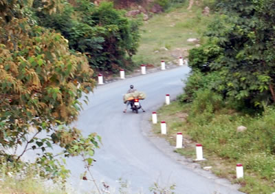 | Lâm tặc vận chuyển gỗ lậu trên đường Hồ Chí Minh (đoạn sát TT Thành Mỹ) dừng chân tại khúc cua để liên lạc với “chim lợn” thám thính tình hình. |