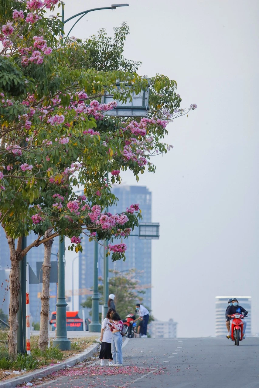 "Đối với mình, hoa kèn hồng luôn mang vẻ nét dễ thương, đi làm về dù có mệt, có nóng bức đến mấy thì ngắm những cụm hoa kèn hồng nở làm mình cảm thấy nhẹ nhàng hơn, thấy đường phố cũng đáng yêu hơn. So với mọi năm, không khí năm nay có vẻ vắng lặng hơn, mọi người ít ra đường chụp ảnh. Phần vì do thời tiết khá cũng nóng bức, phần cũng vì hoa năm nay trổ không đồng loạt. " - Chị Phương Lan (quận 2) chia sẻ.