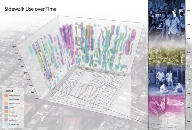 Ngoài việc quan sát và phỏng vấn, chúng tôi đã khảo sát việc sử dụng không gian vỉa hè tại các thời điểm khác nhau trong ngày và các ngày trong tuần. Chúng tôi đặc biệt chú trọng tới việc khảo sát các hoạt động được tổ chức thêm cho người đi bộ chẳng hạn như ăn uống, bán hàng tự động cũng như vị trí đỗ xe và các biển hiệu dành cho vỉa hè. Chúng tôi ghi nhận được những thông tin về giới tính, số lượng người tham gia vào từng hoạt động, vị trí và số lượng của những không gian được sử dụng, rồi kết hợp chúng với những gì mà chúng tôi đã thu được trong các cuộc phỏng vấn về việc làm thế nào họ có thể thỏa thuận để có được chỗ ngồi và sự chia sẻ những chỗ ngồi đó. Dữ liệu mà chúng tôi quan sát được không chỉ là quan sát về vấn đề môi trường hay sử dụng đất mà còn là vấn đề về nhân chủng học. Và mặc dù chúng tôi có nhận được những lời khuyên nên sử dụng các thiết bị công nghệ cao để thu thập các dữ liệu, nhưng chúng tôi nhanh chóng phát hiện ra rằng việc sử dụng giấy và bút thông thường là cách hiệu quả nhất và thích hợp nhất cho quy mô của sự nghiên cứu rất phức tạp và thân thiên như thế này. Cuối cùng, chúng tôi thu thập gần 4000 quan sát và đã được mã hóa vào ArcGIS. Dữ liệu này đã làm sáng tỏ tính linh hoạt và tiềm năng trong việc sử dụng không gian vỉa hè.