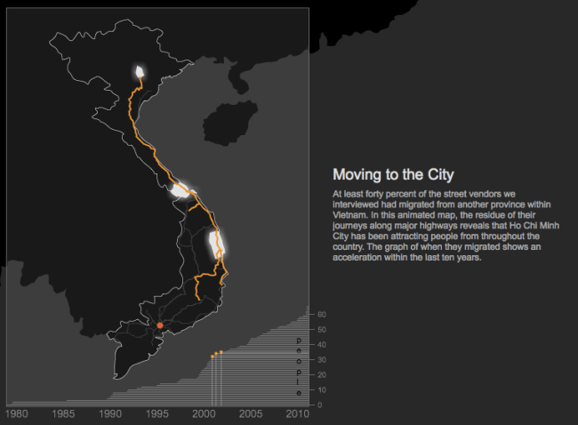 Ít nhất bốn mươi phần trăm những người bán dạo trên đường phố mà chúng tôi phỏng vấn đã di cư từ các tỉnh khác trong phạm vi Việt Nam đến. Trong bản đồ chuyển động này, số lượng chuyến đi của họ dọc theo đường cao tốc cho thấy rằng thành phố Hồ Chí Minh đã thu hút được người dân từ khắp đất nước.