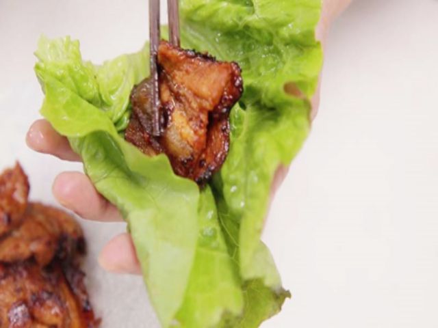 Bước 4: Khi thịt đã chín, tách thịt ra đĩa. Lá xà lách cắt đôi, đặt miếng thịt nướng + dưa chuột + kim chi + một chút rau thơm ở giữa. Cuộn tròn lại và thưởng thức.
