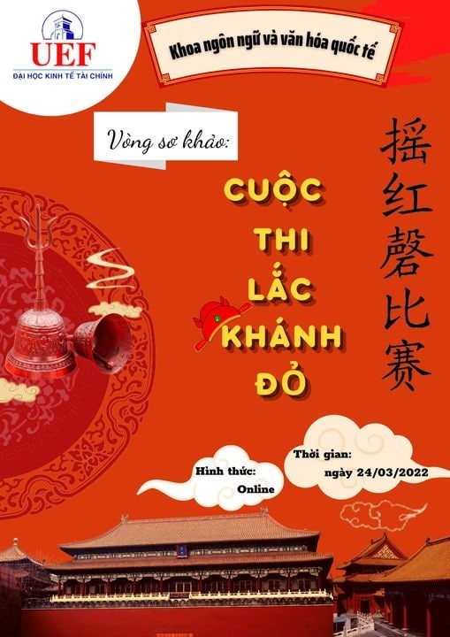 Trước đó, UEF cũng đã tổ chức nhiều hoạt động để sinh viên tìm hiểu về đất nước Trung Quốc trên các lĩnh vực Cơ cấu giải thưởng: - 01 Giải Nhất: 1.000.000 VNĐ - 01 Giải Nhì: 700.000 VNĐ - 01 Giải Ba: 500.000 VNĐ - 03 Giải khuyến khích: 200.000 VNĐ Bên cạnh đó, tất cả các thí sinh khi tham gia chương trình đều được cộng điểm rèn luyện theo quy định. Cuộc thi “Lắc Khánh Đỏ” không chỉ là hoạt động dành riêng cho các bạn sinh viên ngành Ngôn ngữ Trung Quốc mà còn dành cho tất cả UEFers có niềm yêu thích đối với ngôn ngữ và văn hóa Trung Hoa. Cùng theo dõi và chờ đón sự lộ diện những gương mặt xuất sắc nhất của sân chơi thú vị này nhé! Minh Hảo TIN LIÊN QUAN UEFers chương trình Tài năng khám phá mô hình sản xuất và quản trị doanh nghiệp tại Nhà máy Heineken UEFers khẳng định dấu ấn cá nhân đầy sáng tạo qua buổi công chiếu Đồ án New Media FTHMers được rèn luyện tư duy chuyên nghiệp, tự tin bước vào kỳ thực tập doanh nghiệp UEF tổng kết công tác xây dựng Đảng năm 2025, định hướng nhiệm vụ trọng tâm năm 2026 Khoa Tài chính - Kế toán thảo luận về văn hóa chất lượng trong hoạt động đào tạo và chăm sóc người học Nổi bật ĐĂNG KÝ XÉT HỌC BỔNG UEF Từ khóa » Khánh đỏ