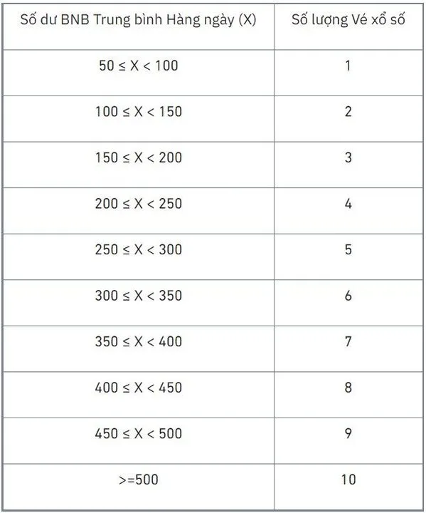 Người dùng có thể nhận được tối đa 10 vé dựa trên số dư BNB hold trung bình hàng ngày (ký hiệu là X) trong khoảng thời gian 7 ngày trước thời điểm nhận vé.