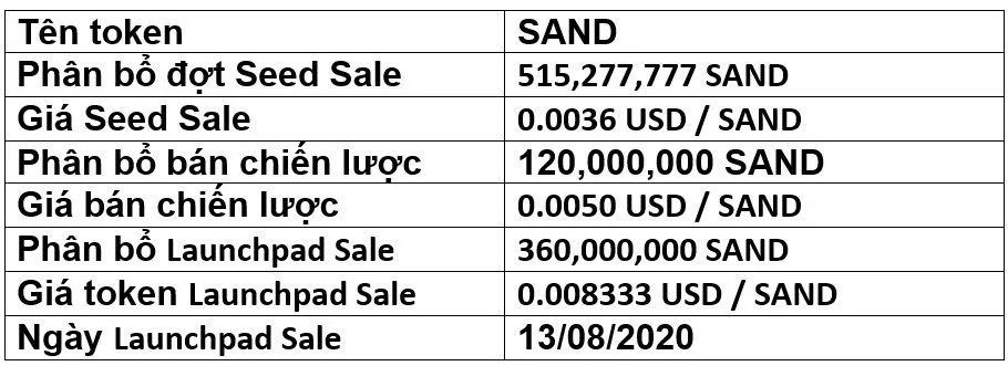 - Tổng số token được phân bổ cho Binance Launchpad: 360.000.000 SAND (chiếm 12% tổng cung token)