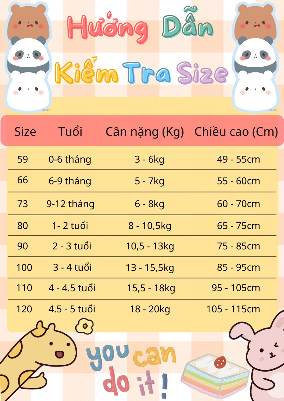 Lưu ý: Bảng size này chỉ là số liệu tương đối tham khảo, Bé có số cân nặng hoặc chiều cao vượt qua độ tuổi thì nên chọn size lớn hơn để trừ hao ạ. Khách chọn size cho bé không nên lấy sát số kg.