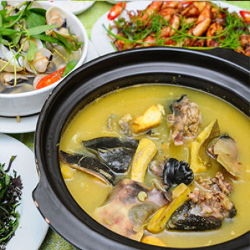 Ngao hấp: 1kgMực trứng chiên : 0,5 kgBa ba om chuối đậu :+ Baba: khoảng 1 kg+ Rau ăn kèm+ Bún