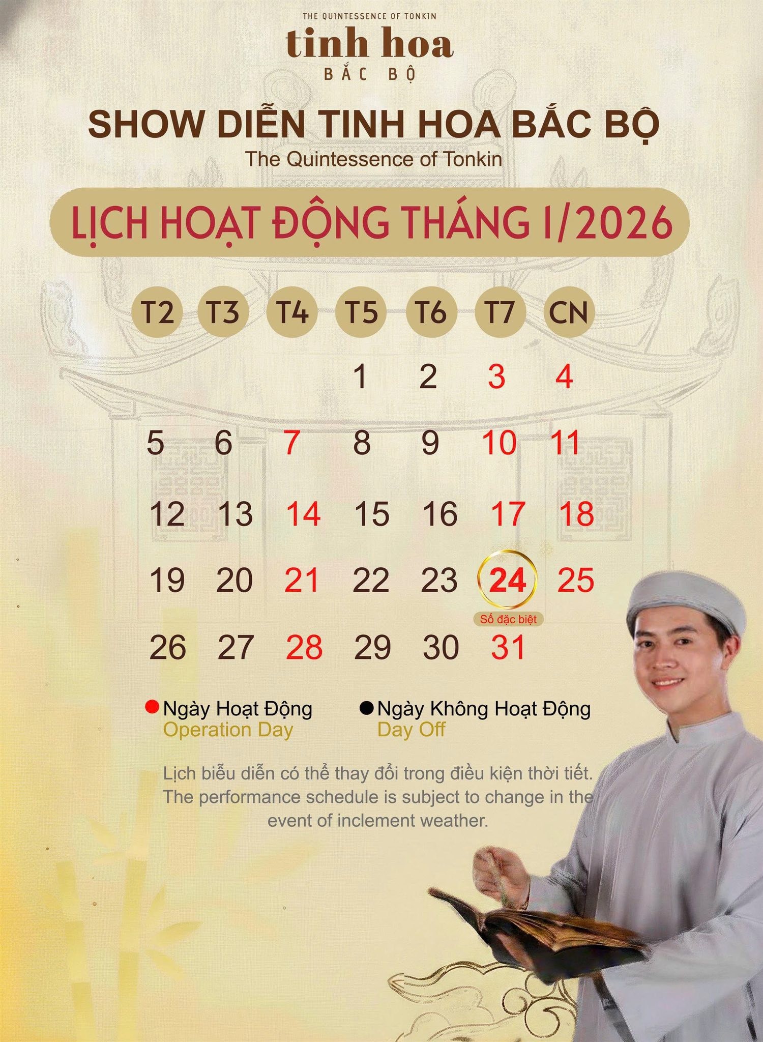 • Sau khi kết thúc show, xe sẽ đón khách tại cổng khu biểu diễn Tinh Hoa Bắc Bộ.
