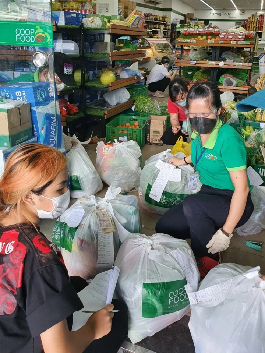 Các siêu thị đã có thêm nhiều nhân viên phối hợp cùng lực lượng đi chợ hộ quận Bình Tân giúp giao hàng nhanh hơn. Ảnh: P.THỦY