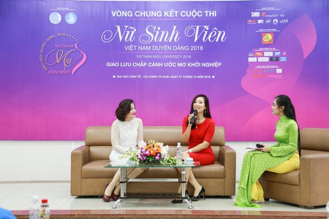 Các thí sinh VMU hào hứng tham gia hội thảo "Chắp cánh ý tưởng khởi nghiệp" tại hội trường lớn UEF Tham gia Hội thảo, sinh viên UEF đã có dịp giao lưu và trao đổi kinh nghiệm cùng ThS.Trương Lý Hoàng Phi, Giám đốc điều hành Trung tâm Hỗ trợ thanh niên khởi nghiệp (BSSC), Tổng Thư ký Hội Doanh nhân trẻ TP.HCM (YBA) về những thuận lợi và khó khăn trong quá trình khởi nghiệp khi ra trường. Bên cạnh đó, ThS.Trương Lý Hoàng Phi còn nhấn mạnh khâu chuẩn bị kiến thức, kỹ năng cho chặng đường nghề nghiệp tương lai khi vẫn còn ngồi trên giảng đường đại học. Tham gia chương trình hội thảo lần này còn có Á hậu Thu Hương – Á hậu quý bà Thế giới năm 2011. Á hậu Thu hương cũng đã chia sẻ cùng top 30 gương mặt nữ sinh viên Việt Nam duyên dáng cũng như sinh viên UEF về những thách thức trên con đường đi đến thành công trong việc “start – up” bằng vốn kinh nghiệm phong phú, vững chắc. Qua những chia sẻ bổ ích đã khơi dậy niềm đam mê khởi nghiệp trong các bạn sinh viên. Bên lề chương trình, sinh viên UEF cũng đã gặp gỡ, giao lưu với những gương mặt tiêu biểu của VMU 2016. Đây chính là cơ hội để các bạn nữ sinh viên UEF tham gia vào cuộc thi “Sinh viên UEF duyên dáng, tài năng” học hỏi kinh nghiệm cho những phần tranh tài gay cấn sắp tới. Cùng xem lại những hình ảnh sinh viên UEF đồng hành cùng top 30 cuộc thi VietNam Miss University 2016: