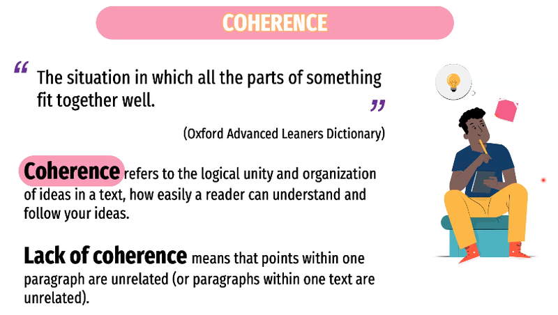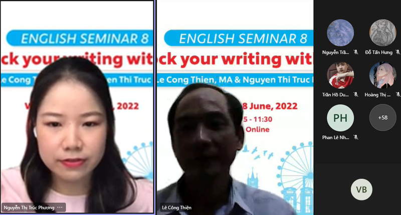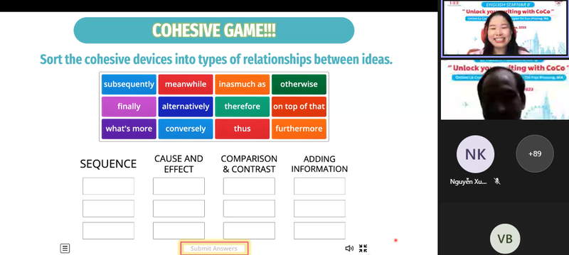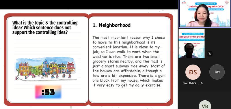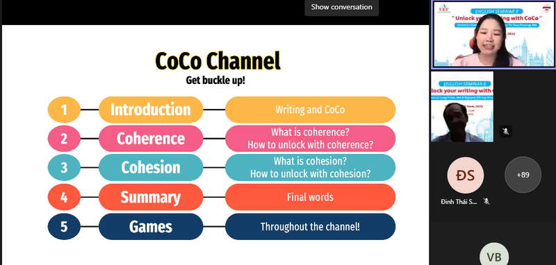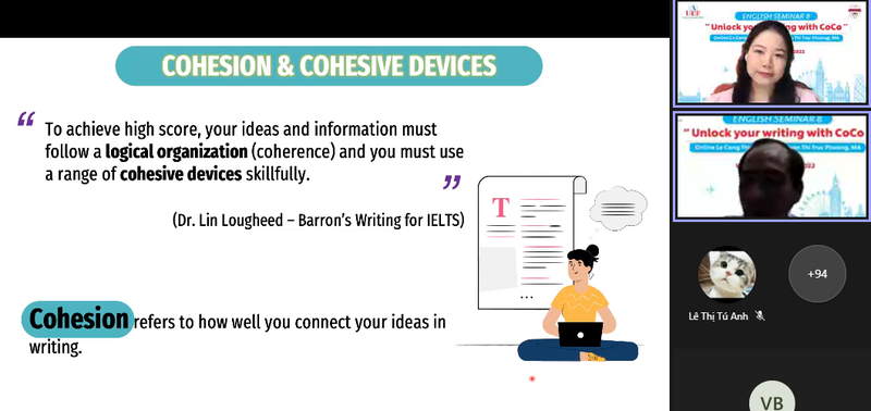 Hai giảng viên đã mang đến nhiều chia sẻ bổ ích về kỹ năng viết tiếng Anh cho sinh viên Tiêu chí “Coherence and Cohesion” nhằm đánh giá bài viết của thí sinh có dễ đọc, mạch lạc và dễ hiểu hay không. Coherence - tính mạch lạc là về sự thống nhất của các ý tưởng; Cohesion - tính liên kết là sự thống nhất của các yếu tố cấu trúc. Để bài viết được mạch lạc, các bạn cần xác định rõ các yếu tố như: chủ đề bài viết là gì (what is the topic), những luận điểm nào cần triển khai (controlling idea), loại bỏ những nội dung không liên quan (unrelated point). Còn về tính liên kết, chúng ta có thể sử dụng các từ nối, từ chuyển tiếp, đại từ thay thế,… trong bài viết. Những từ thường được sử dụng như: so, yet, but, moreover, for instance, furthermore, consequently, certainly, nevertheless, in addition, in other words,...