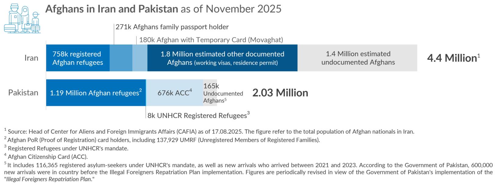 Iran and Pakistan are among the world’s major refugee-hosting countries, hosting 3.47 million and 1.75 million Afghan refugees respectively, despite facing their own challenges. Since 2023, a shift in displacement trends has been taking place that has seen mass returns, including large numbers of forced and coerced returns, back to Afghanistan. On 7 March 2025, the Government of Pakistan announced the resumption of the 'Illegal Foreigners Repatriation Plan', initially targeting Afghan Citizenship Card (ACC) holders, who were instructed to leave voluntarily by 31 March or face deportation from 1 April. On 31 July, the Government expanded the plan to also include Afghan refugees holding Proof of Registration (PoR) cards. In parallel, following Headcount slip expiry on 20 March 2025, the Government of Iran launched a regularization/return scheme for some two million affected Afghans where the majority were expected to return to Afghanistan by the Government deadline of 6 July 2025 or face deportation. These mass returns in adverse circumstances have strained Afghanistan’s already overstretched resources and services and hindered reintegration efforts, leading to risks of onward and new displacement, including return movements back into Pakistan and Iran and onward. UNHCR reiterates its concern that many Afghans – regardless of status – face serious protection risks in Afghanistan due to the current human rights situation, especially women and girls. These risks are made more urgent by critical funding shortfalls, with only 24% of the required $478 million secured for the Afghanistan situation. This page provides updates on UNHCR's work in support of Afghan IDPs, refugees, and returnees. Links are also provided below for individual UNHCR country operation pages for additional information.