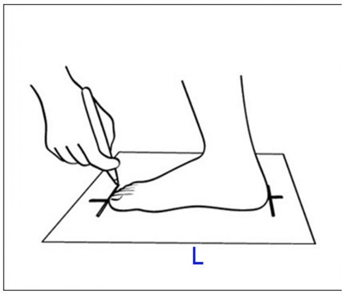 Bạn sử dụng bút chì và vẽ một đường thẳng chạm vào mũi chân và gót chân của bạn, và tiếp tục đánh dấu ở 2 bên của bàn chân để chúng ta đo chiều dài chân nhé. Nếu như các bạn chưa nắm rõ thì có thể tham khảo thêm hình bên dưới.
