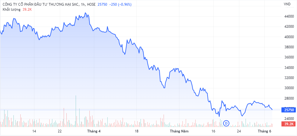 Trên thị trường chứng khoán, chốt phiên giao dịch ngày 2/6, cổ phiếu SMC giảm 650 đồng về mức 25.750 đồng/cp, khối lượng khớp lệnh 143.500 đơn vị.