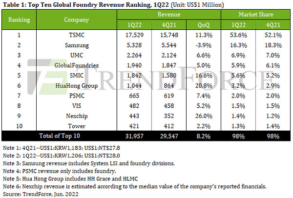 Even without the most advanced nodes, Chinese foundries (SMIC, HuaHong and to some extent Nexchip) were the fastest growing (see QoQ per cent in the below chart) in the first quarter of 2022 as per data released by trendforce.