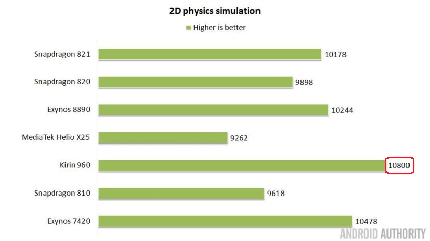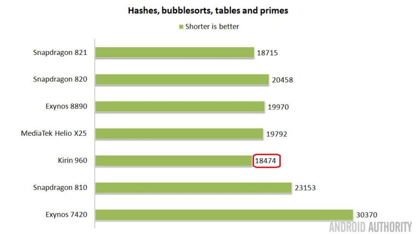 Kết quả bài benchmark này vẫn khẳng định vị trí của Kirin 960 cùng với Snapdragon 821 với thời gian nhanh nhất. Nhưng điều đáng ngạc nhiên là MediaTek Helio X25 đứng ở vị trí tiếp sau với kết quả nhỉnh hơn đôi chút so với Exynos 8890, trong khi trước đó SoC này cho thấy điểm số khá thất vọng với bài kiểm tra GeekBench và AnTuTu. Càng đáng ngạc nhiên hơn khi X25 chỉ có 2 lõi hiệu suất cao là Cortex-A72 trong khi phần còn lại là các lõi Cortex-A53 hiệu suất thấp hơn.