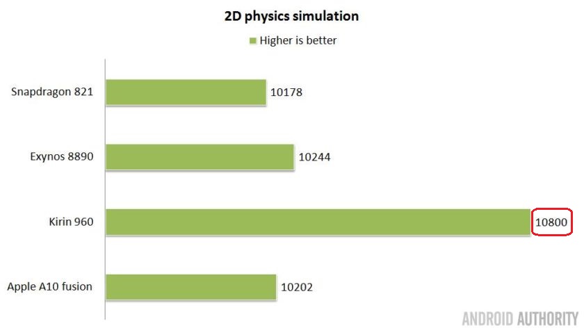 Ngoài ra, trong bài kiểm tra mô phỏng giọt nước, SoC Apple A10 tiếp tục không thể đạt được điểm số tuyệt đối như Huawei Kirin 960. Chip A10 chỉ nhỉnh hơn chút ít so với Snapdragon 821 và vẫn đứng sau Exynos 8890 với 10.244 điểm. Điều thú vị là ngay cả Exynos 7420 cũng có điểm số cao hơn A10 (Exynos đạt 10.478 điểm ở bài kiểm tra trên, so với A10 chỉ có 10.202).