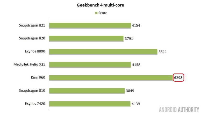 Trong khi đó, MediaTek Helio X25 dường như lại gây thất vọng vì điểm số thấp cho dù có 10 lõi, nhưng hầu hết là các lõi tiết kiệm điện năng Cortex-A53. Người chiến thắng chung cuộc với điểm số này là Kirin 960 trong khi Exynos 8890 bám sát ngay sau. Rõ ràng rằng, sắp tới có thể sẽ có một cuộc chiến về bộ xử lý giữa Samsung và Huawei.