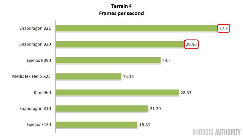 Người chiến thắng ở đây là Adreno 530 trong Snapdragon 820 và 821. Tiếp theo sau là ARM Mali G71 trong Kirin 960 và sau đó là Mali-T880 trong Exynos 8890. Mặc dù Helio X25 cũng sử dụng GPU như Exynos, nhưng do chỉ có 4 lõi so với 12 lõi của Exynos, hiệu suất của X25 tỏ ra thấp hơn hẳn so với đối thủ của mình.