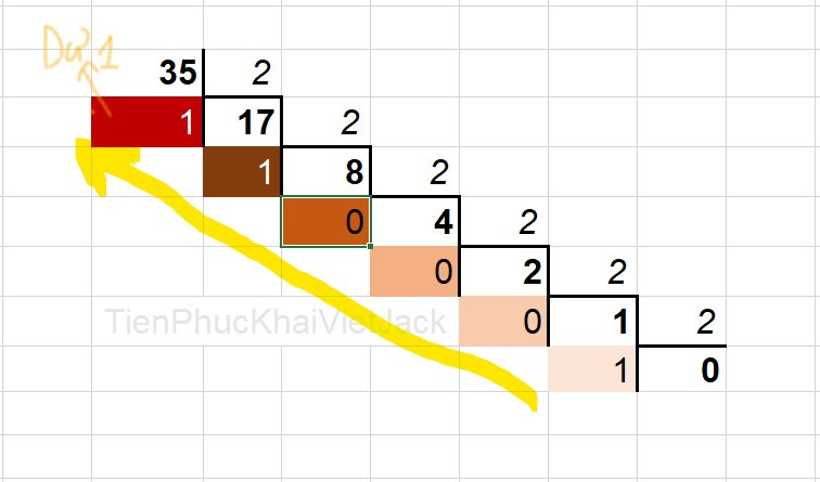 Cách làm: Lấy số đang ở cơ số chia cho 2, viết số dư ra, sau đó lần lượt lấy thường chia tiếp cho 2 cho đến khi không chia được nữa, kết quả thu được là các số dư viết theo chiều mũi tên vàng