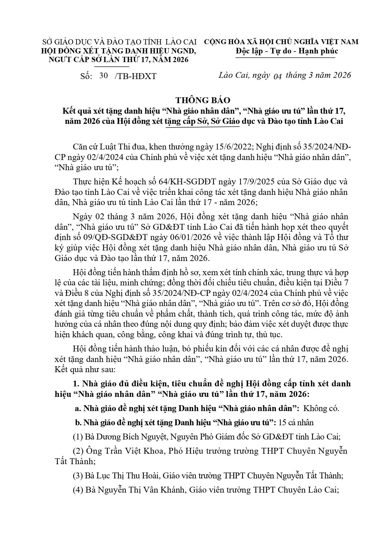 THÔNG BÁO Kết quả xét tặng danh hiệu “Nhà giáo nhân dân”, “Nhà giáo ưu tú” lần thứ 17, năm 2026 của Hội đồng xét tặng cấp Sở, Sở Giáo dục và Đào tạo tỉnh Lào Cai -