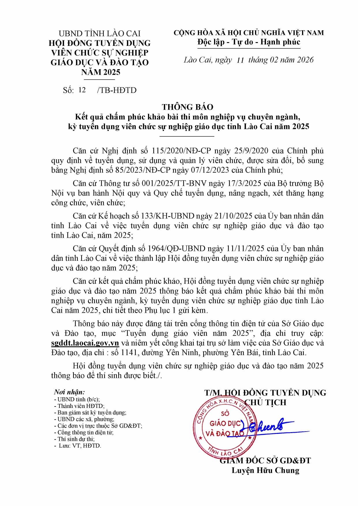 THÔNG BÁO Kết quả chấm phúc khảo bài thi môn nghiệp vụ chuyên ngành, kỳ tuyển dụng viên chức sự nghiệp giáo dục tỉnh Lào Cai năm 2025 -