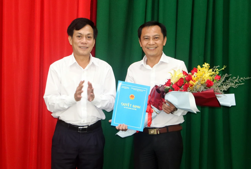 Ông Nguyễn Ngọc Hè (bìa trái) Phó Chủ tịch UBND TP Cần Thơ trao Quyết định bổ nhiệm cho ông Nguyễn Hoàng Tùng. Ảnh: CHÂU ANH