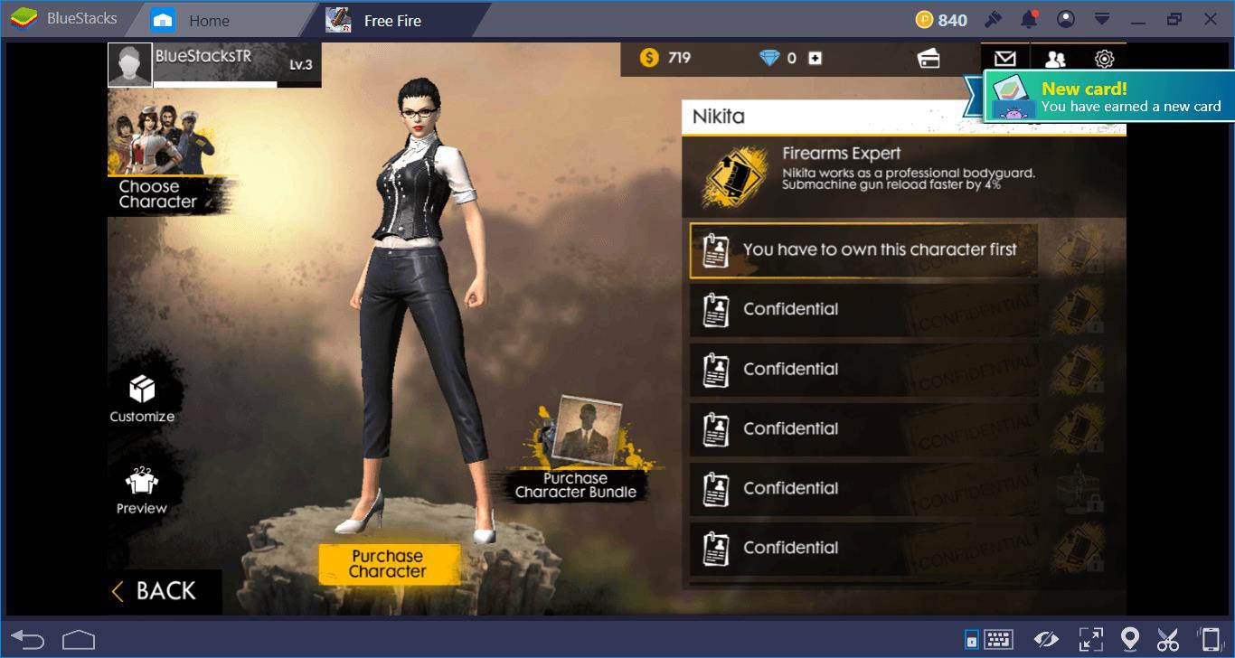 Free Fire cung cấp một tính năng độc đáo mà không thể tìm thấy trong các trò chơi khác: chỉ số nhân vật. Trong PUBG Mobile và ROS, về cơ bản bạn không là ai cả (unknown). Người chơi đơn giản chỉ là một nhân vật đang cố gắng sống sót. Song Free Fire cung cấp một nhân vật đã được xác định danh tính và sở hữu các tính năng độc đáo, đặc trưng cho mỗi người. Ví dụ, nhân vật tên Nikita có thể đổi vũ khí nhanh hơn.