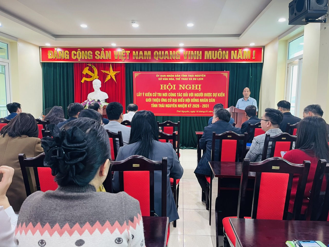 Hội nghị lấy ý kiến cử tri nơi công tác đối với người được dự kiến giới thiệu đại biểu Hội đồng nhân dân tỉnh, nhiệm kỳ 2026 - 203117/01/2026 18:21:00 Chiều ngày 16/01/2026, Sở Văn hóa, Thể thao và Du lịch tỉnh Thái Nguyên đã tổ chức Hội nghị lấy ý kiến cử tri nơi công tác đối với người được dự kiến giới thiệu ứng cử đại biểu Hội đồng nhân dân tỉnh, nhiệm kỳ 2026 - 2031. | |