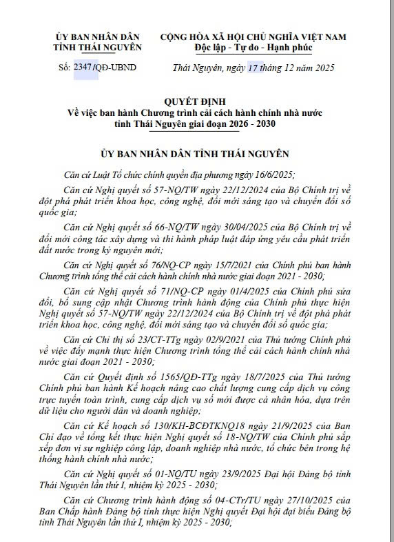 Thái Nguyên ban hành Chương trình cải cách hành chính nhà nước giai đoạn 2026-2030 Thứ tư, 24/12/2025 -