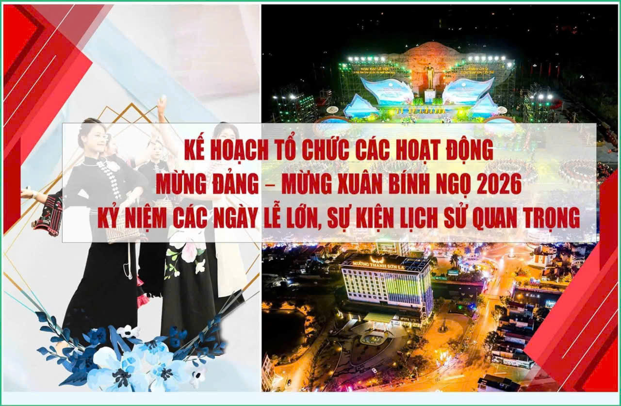 Kế hoạch tổ chức các hoạt động mừng Đảng - mừng Xuân Bính Ngọ 2026; kỷ niệm các ngày lễ lớn, sự kiện quan trọng trong năm 2026 Ngày 06/01/2025, UBND tỉnh Sơn La ban hành Kế hoạch số 06/KH-UBND tổ chức các hoạt động văn hóa, văn nghệ, thể dục thể thao và du lịch mừng Đảng, mừng Xuân Bính Ngọ; kỷ niệm các ngày lễ lớn và sự kiện lịch sử quan trọng trong năm 2026 -