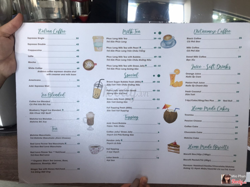 - Khá tốt Viết bình luận Thông tin & Bản đồ Báo lỗi vị trí Thời gian hoạt động Đang mở cửa 07:00 - 22:30 Thích hợp Buổi sáng , Buổi trưa , Buổi xế , Buổi tối Thời gian chuẩn bị Khoảng 5 - 10 phút Nghỉ lễ Các ngày lễ trong năm Thể loại Café/Dessert Sức chứa 50 người lớn Phong cách ẩm thực Món Việt Phù hợp với Hẹn hò , Họp nhóm , Takeaway - Mang về Phục vụ các món Trà chanh , Café - Kem , Sinh tố - Nước ép , Thức uống , Trà sữa Giấy phép/chứng nhận Xem