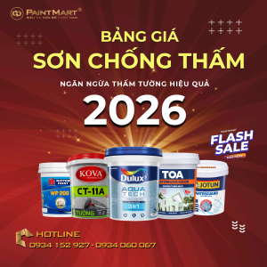 Bảng giá sơn chống thấm mới nhất 2026 Paintmart hiện là đại lý cấp 1 các thương hiệu kể trên do đó sơn chống thấm màu hội tụ tại showroom chúng tôi bao la luôn. Paintmart sẽ tổng hợp một bảng giá sơn chống thấm màu bao gồm đầy đủ các loại sơn chống thấm màu đang được phân phối tại hệ thống chúng tôi.