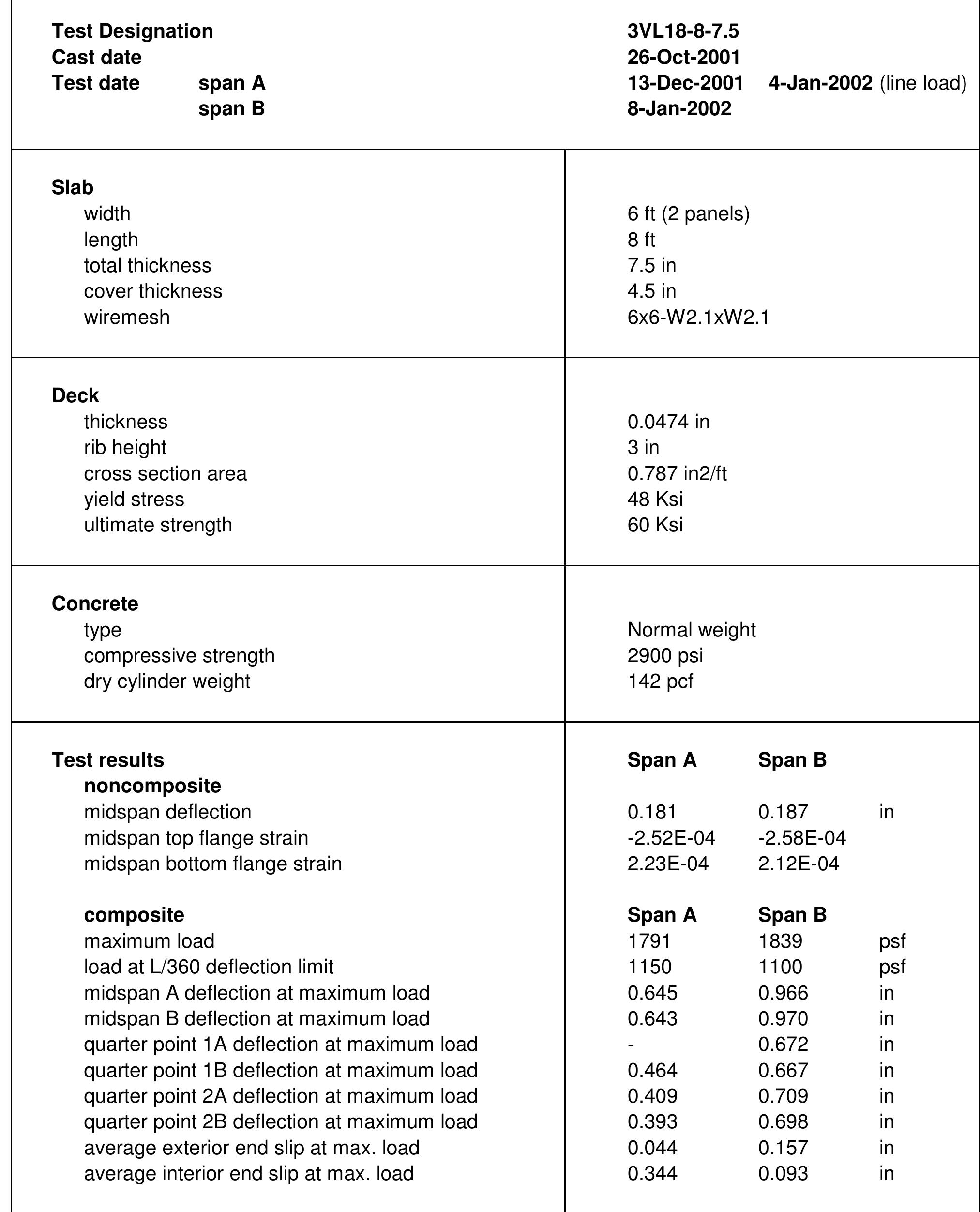 What factors influenced composite slab strength in the Vulcraft test specimens?addThe study reveals that slab strength was primarily governed by shear bond, with peak loads correlated to slip. Variations in deck depth, thickness, and span length were critical in evaluating these factors.