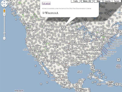 Dịch vụ này sẽ kết hợp với công cụ bản đồ vệ tinh Google Maps. Sau khi truy cập vào trang web: http://maps.google.com, bạn cần vào phần More… rồi kích hoạt lớp tính năng Wikipedia. Khi đó trên bản đồ sẽ xuất hiện những biểu tượng ký tự “W” gắn với mỗi địa điểm.