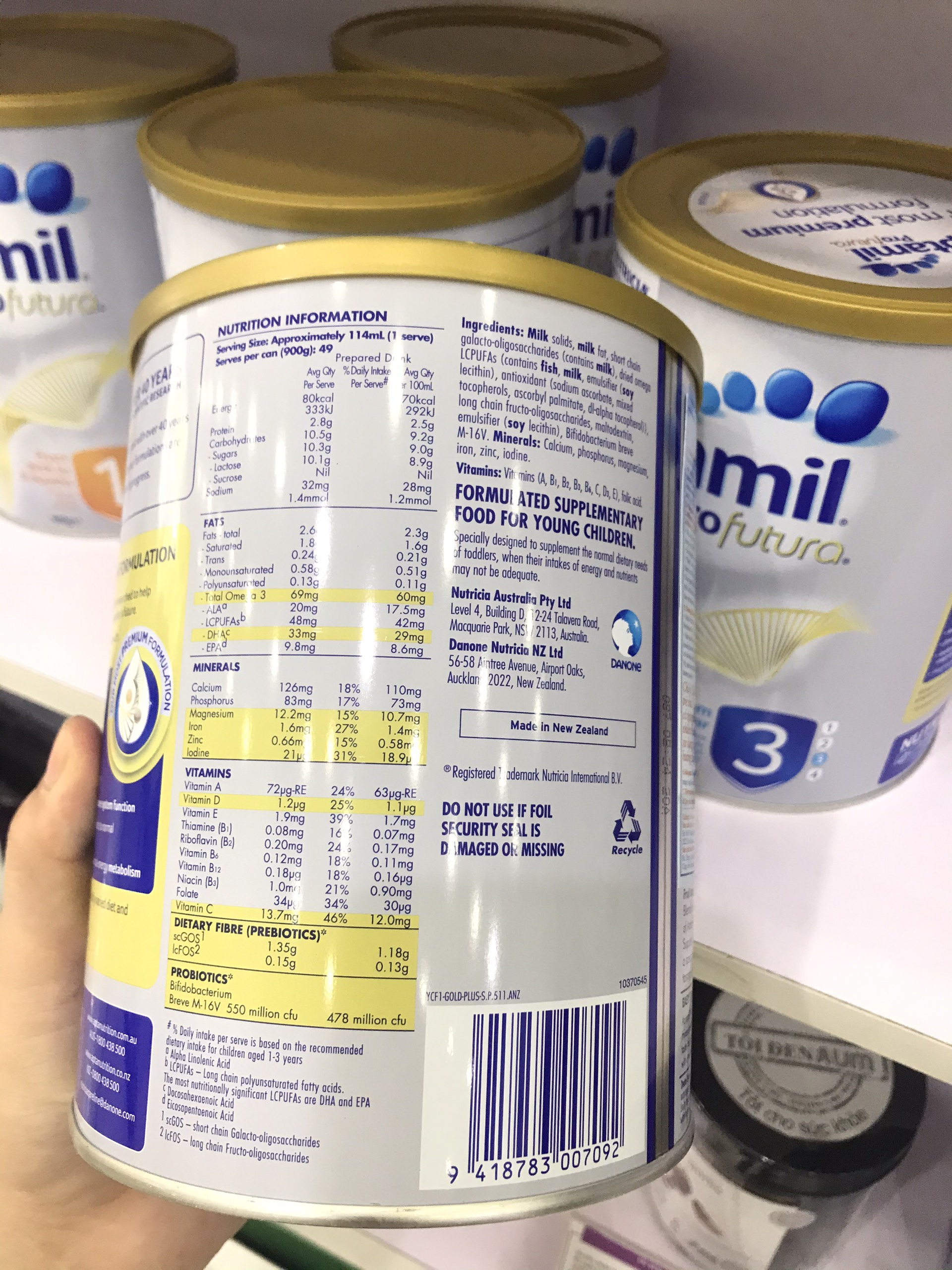 Ngoài ra đối với Aptamil Úc số 3 giai đoạn này còn được bổ sung thêm Kẽm và sữa non giúp tăng cường hệ miễn dịch cho bé, giúp cho bé khám phá thế giới mà không lo vi khuẩn môi trường xung quanh. Và khi nhìn vào bảng thành phần dinh dưỡng nhà sản xuất in trên hộp sữa mẹ sẽ thấy trong sữa còn bổ sung rất nhiều vitamin và khoáng chất giúp bé tăng trưởng và phát triển toàn diện nhất.