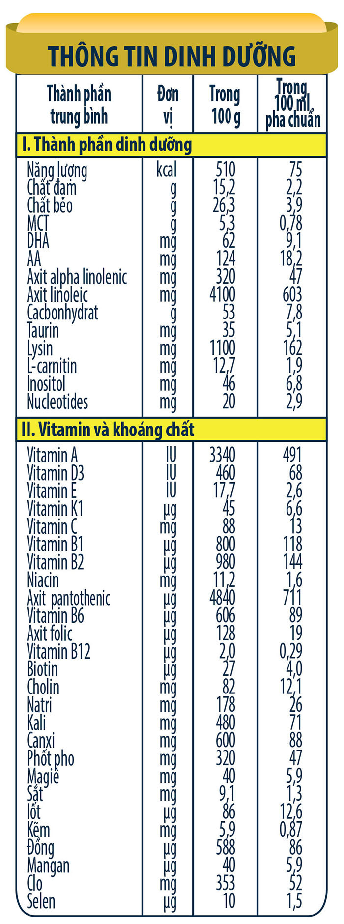 | Cách pha chuẩn: 1 muỗng gạt (tương đương 4,9g) pha với 30ml nước. Đối với trẻ sơ sinh sinh non, nhẹ cân: tùy thuộc vào cân nặng và trình trạng của trẻ, pha theo hướng dẫn của bác sĩ. | |||