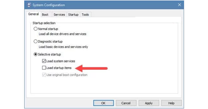 Bước 2: Vào đến phần System Configuration ,ngay phần đầu tiên bạn tích bỏ chọn Load Startup items đi nhé.