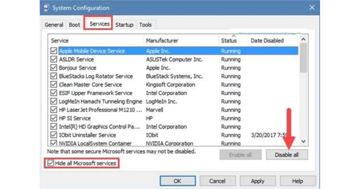 Bước 3: Tiếp tục sang tab Services rồi tích vào Hide all Microsoft services rồi sau đó chọn Disable all để tiến hành loại bỏ toàn bộ tiến trình khi khởi động máy tính.