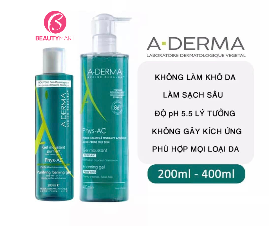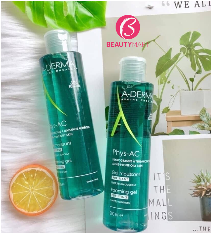 - Sữa rửa mặt dạng gel A-Derma Phys-AC Purifying thích hợp để sử dụng hàng ngày giúp làm sạch da, mềm da, kháng viêm bảo vệ da một cách hiệu quả khỏi các tác nhân gây hại và ngăn ngừa mụn hiệu quả. Để tối ưu hoá hiệu quả của sữa rửa mặt, các bạn có thể dùng bông tạo bọt, máy rửa mặt hoặc các sản phẩm hỗ trợ khác nhé! Ngoài ra, nên sử dụng kết hợp các sản phẩm toner, tinh chất trị mụn cùng dòng để mang lại hiệu quả tốt nhất cho làn da của bạn.