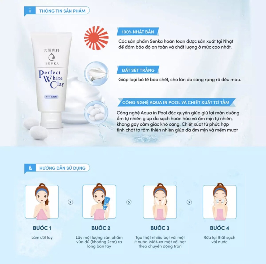 Giàu khoáng chất tự nhiên, đất sét trắng nhẹ nhàng làm sạch và thúc đẩy quá trình trao đổi chất của da.Kết hợp công dụng từ thành phần “sericin” trong kén tơ tằm trắng và chất “hydrolyzed silk” được lấy từ lõi của sợi tơ tằm, giúp cho hiệu quả dưỡng ẩm trọn vẹn hơn gấp nhiều lần.Sericin: Có khả năng tương thích cao với làn da, sericin có thể hình thành một màng bảo vệ, phát huy tối đa tác dụng dưỡng ẩm, giúp giữ kết cấu da mềm mịn.Hydrolyzed silk: Lớp sừng có tác dụng bảo vệ da khỏi các tác động bên ngoài. Hydrolyzed silk có khả năng thúc đẩy sự phục hồi của lớp sừng như hàng rào bảo vệ da.Bổ sung Sodium Acetylated Hyaluronate, còn gọi là Super Hyaluronic Acid, hợp chất gồm 2 loại Hyaluronic acid làm tăng hiệu quả và duy trì tác dụng giữ ẩm.Lớp bọt dày, vẫn tiếp tục duy trì trong suốt thời gian rửa mặt.Làn da được làm sạch một cách nhẹ nhàng và thư giãn trong lớp bọt xốp dày và trắng mịn.Bọt tơ tằm nhiều và mịn giúp len lỏi vào sâu bên trong lỗ chân lông, làm sạch hoàn hảo bụi bẩn và bã nhờn.Đất sét trắng giúp loại bỏ tế bào chết, cho làn da sáng rạng rỡ, đều màu.Công nghệ Aqua in Pool độc quyền từ Shiseido giúp giữ lại màn dưỡng ẩm tự nhiên của da.Da sạch hoàn hảo nhưng vẫn ẩm mịn tự nhiên, không gây cảm giác khô căng.Chiết xuất từ phức hợp tinh chất tơ tằm thiên nhiên và gấp đôi Hyaluronic acid giúp da ẩm mịn và mềm mượt.Khối lượng: 120gr.Xuất xứ: Nhật Bản.