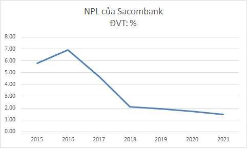 Có thể thấy rõ tỷ lệ nợ xấu (NPL) của Sacombank có sự cải thiện đáng kể trong giai đoạn 5 năm gần đây. Việc sáp nhập Ngân hàng Phương Nam trong năm 2015 đã đẩy tỷ lệ nợ xấu của Sacombank vọt lên mức 5.8% từ mức 1.46% của năm 2014 và đạt mức đỉnh 6.91% trong năm 2016. Tuy nhiên, những nỗ lực xử lý nợ xấu của Ngân hàng đã dần đưa tỷ lệ NPL về mức 1.94% (2019). Và trong 2 năm nền kinh tế chịu ảnh hưởng nặng nề nhất từ đại dịch, Sacombank đã kéo được tỷ lệ NPL về còn lần lượt 1.7% và 1.47% tại thời điểm cuối năm 2020 và 2021.
