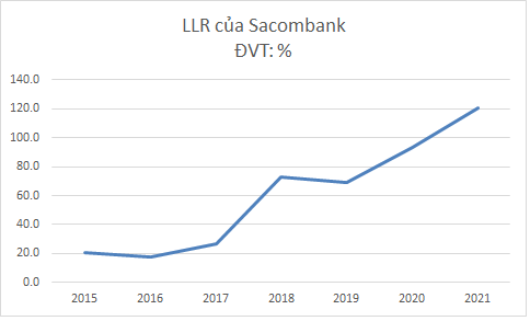 Không chỉ cải thiện ở chỉ tiêu tỷ lệ nợ xấu, tỷ lệ bao phủ nợ xấu (LLR) của Sacombank cũng có sự gia tăng vượt trội kể từ năm 2015. Cụ thể, tỷ lệ LLR giảm mạnh từ mức 90% trong năm 2014 về còn 20.9% trong năm 2015. Tuy nhiên, việc tăng cường trích lập dự phòng và xử lý nợ xấu đã đưa mức LLR của Sacombank tại cuối năm 2021 đạt 121%, cao nhất trong 5 năm gần đây, con số này cho thấy sự chủ động trong chính sách của Ngân hàng.