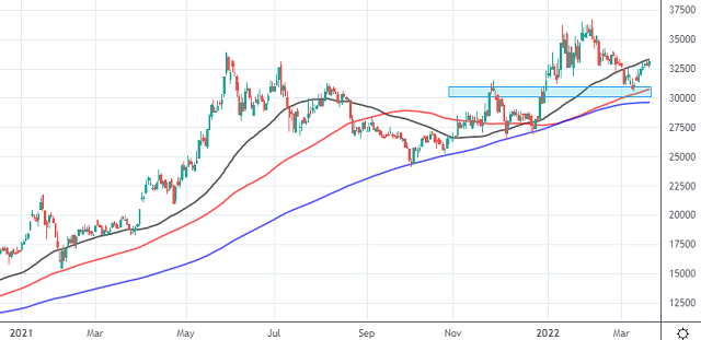 Từ đầu tháng 02/2022, STB xuất hiện trạng thái điều chỉnh và đà giảm đã được tạm dừng khi giá về test lại đỉnh cũ đã bị vượt qua của tháng 11/2021 (vùng 30,000-31,000). Hiện tại, nhịp phục hồi đang quay trở lại và STB đang test đường MA 50 ngày.