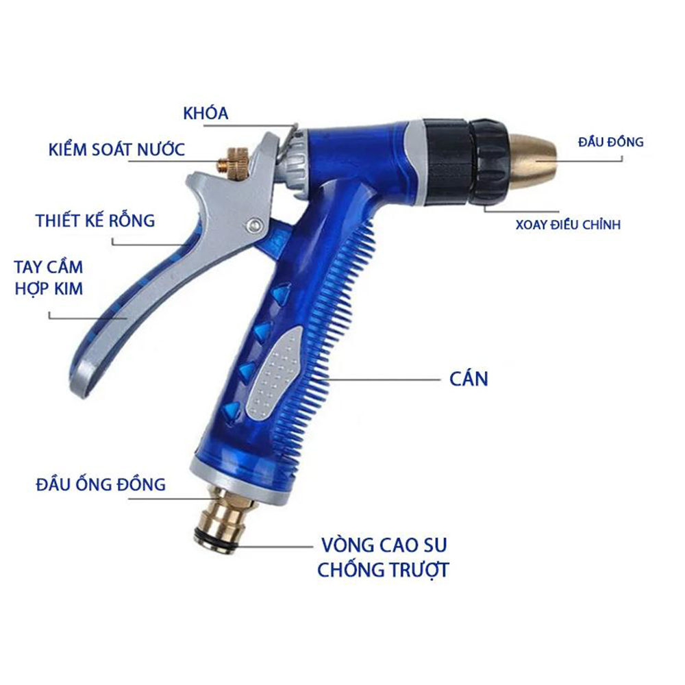 Đầu phun nước: linh hoạt, thiết kế nhỏ gọn, định vị chính xác hướng điChỉnh áp suất nước: Đầu phun chỉnh xoay cho ra tia nước tùy ý: phun thẳng, phun xòe, phun sương.Cò bắn xử lý nước: cầm chắc tay, không đau tay, linh hoạt khi sử dụngDễ dàng lắp đặt. Tương thích với mọi loại dây nướcVật liệu thép cường độ cao, hợp kim đồng.Đa chức năng: Tưới cây; tưới hoa; rửa xe; vệ sinh nhà cửa…