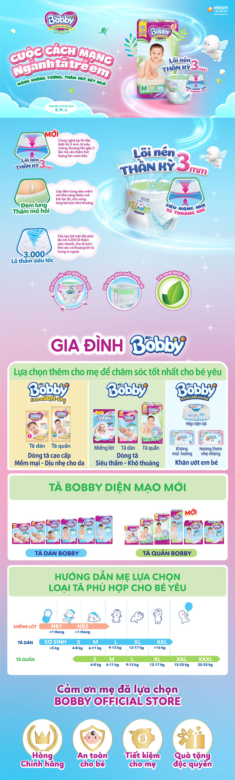 Tã quần Bobby mới- Lõi nén thần kì 3mm- Siêu mỏng khô thoáng là cuộc cách mạng mới trong ngành tã trẻ em.