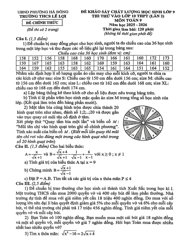 Đề KSCL thi thử vào lớp 10 môn Toán lần 2 năm 2026 trường THCS Lê Lợi – Hà Nội 16/12/2025