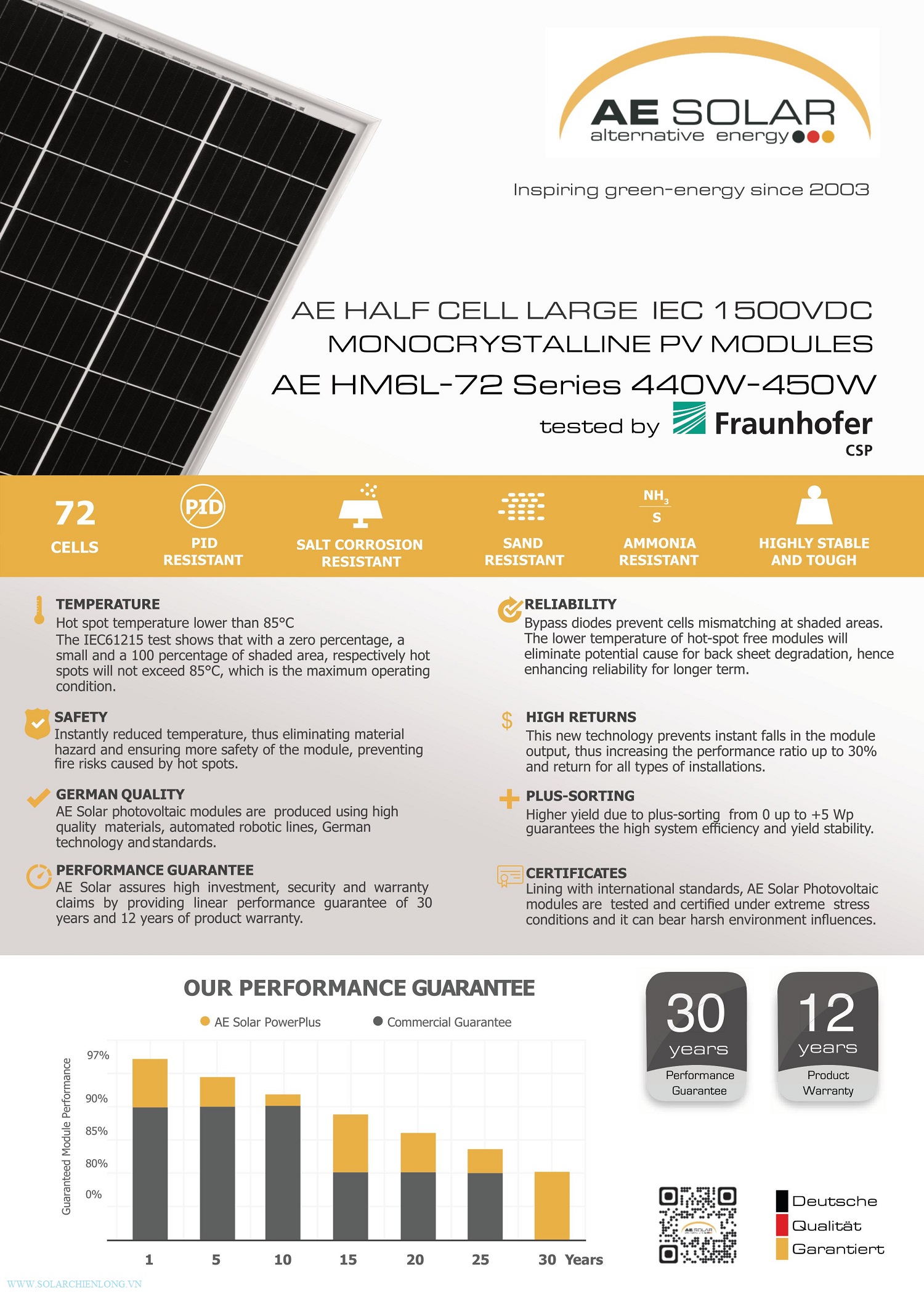 - Hiệu suất làm việc trong suốt thời gian 30 năm là trên 80% con số cao nhất trong các đơn vị sản xuất pin mặt trời hiện nay