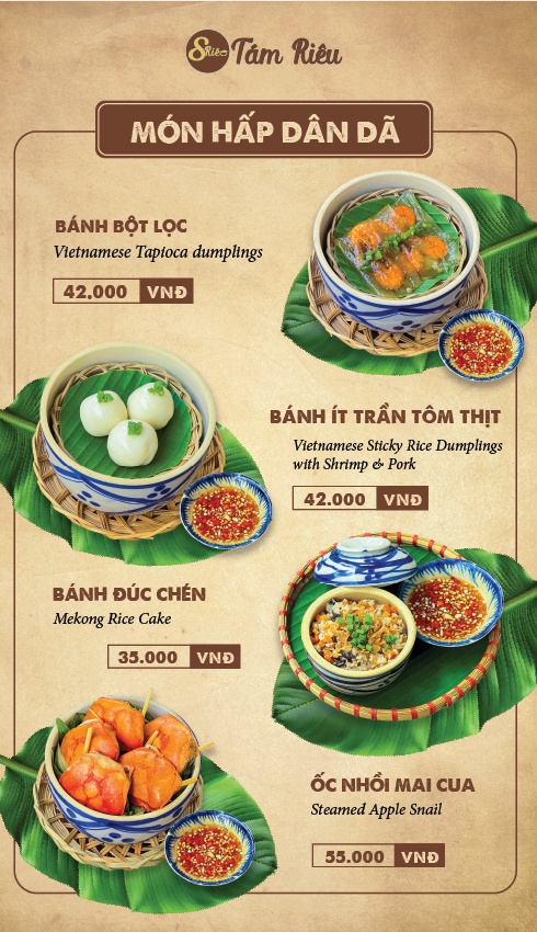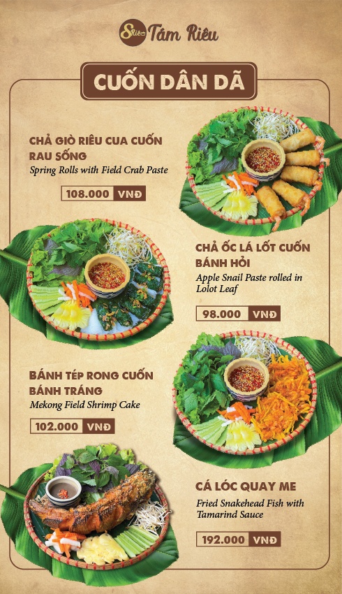 Tám Riêu chuyên phục vụ các món ăn dân dã từ cua đồng với thực đơn phong phú như lẩu cua đồng, bún riêu, bánh đa, ốc nhồi cua đồng, chả giò riêu cua… và nhiều món ăn dân dã khác như bánh tép rong, bánh đúc, nem nướng… đem đến cho quý khách trải nghiệm gần gũi và thuần Việt